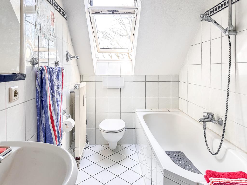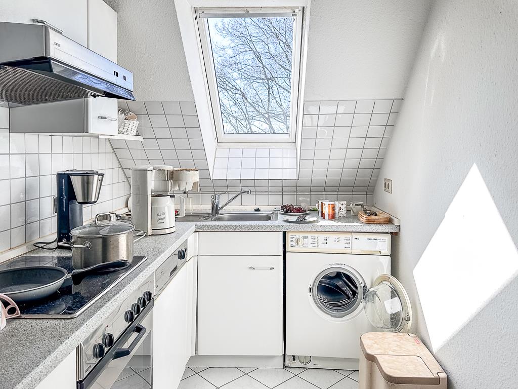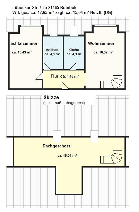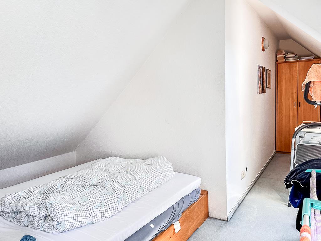 Lt. Teilungserklärung ist diese Wohnung 42,65 m² groß, die Dachbodenfläche darüber misst weitere 15,04 m². Der Ausbau und die Zuordnung sind 1995 im Zusammenhang mit der Umwandlung in Wohnungseigentum vorgenommen worden. Auf der Hauptebene stehen den Bewohnern ein Wohnzimmer mit angrenzender Küche, ein Schlafzimmer und ein Vollbad zur Verfügung. Der Dachbodenraum ist über eine offene Wendeltreppe vom sonnigen Wohnzimmer aus erreichbar. Zwei Dachfenster sorgen für ausreichend Tageslicht, es ist ausreichend Platz z. B. für einen Schreibtisch vorhanden. Dieser Raum ist beispielsweise als Hobbyraum nutzbar, zählt jedoch nicht zur Wohnfläche. Die Wohnung ist ungekündigt und unbefristet vermietet. Die Nettokaltmiete beläuft sich auf 630,00 Euro. Das Hausgeld beträgt gem. WP 2026 derzeit 187,00 Euro monatlich. Der Zustand der Wohnung und die Ausstattung (Einbauküche, Vollbad) ermöglichen bei Bedarf eine kurzfristige Neuvermietung oder eben auch einen Bezug ohne nennenswerte Vorleistungen. Die Räumlichkeiten eignen sich vor allem für Paare. Abweichend von der vorliegenden Bauzeichnung wurde ein Abstellraum, der vom Schlafzimmer ausging, entfernt. Hierdurch konnte das Badezimmer vergrößert und durch ein Fenster aufgewertet werden. Auch im Flur war ein Abstellraum geplant, der entfernt wurde, um die Wohnung insgesamt offener zu gestalten. Eine weitere Abweichung betrifft die Küche. Diese war zunächst als teils offene Küche konzipiert. Um mehr nutzbare Wandfläche zu schaffen, wurde hier eine Wand gezogen.