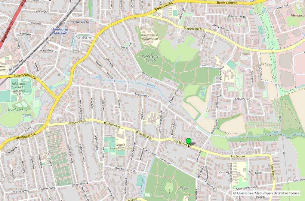 Die Straße Am Sooren verlängert die Brockdorffstraße in östlicher Richtung und verläuft mehr oder minder parallel zur Stellau. Insb. entlang der südlichen Straßenseite stehen zahlreichen Einzelhäuser auf teils sehr großen Gartengrundstücken. Nur einen Spaziergang oder eine Busfahrt von gerade einmal zehn Minuten entfernt liegt sich das Rahlstedter Zentrum. In der Fußgängerzone gibt es zahlreichen Einkaufsmöglichkeiten und Gastrobetriebe, außerdem bietet der Rahlstedter Bahnhof eine hervorragende Anbindung an den ÖPNV.