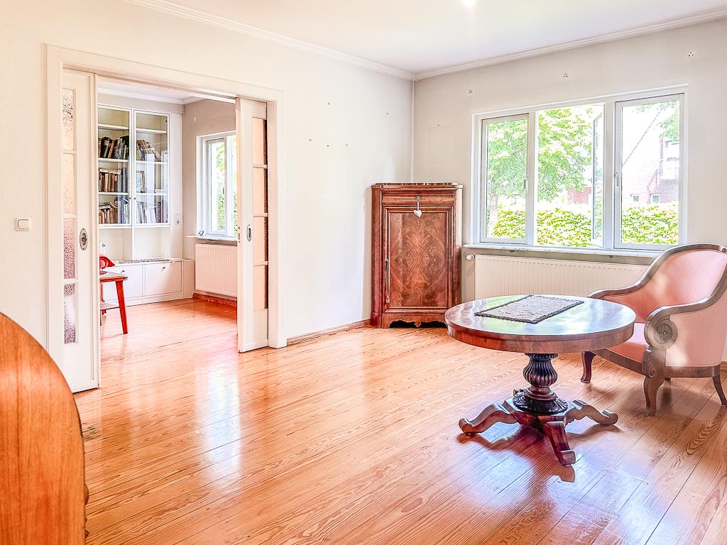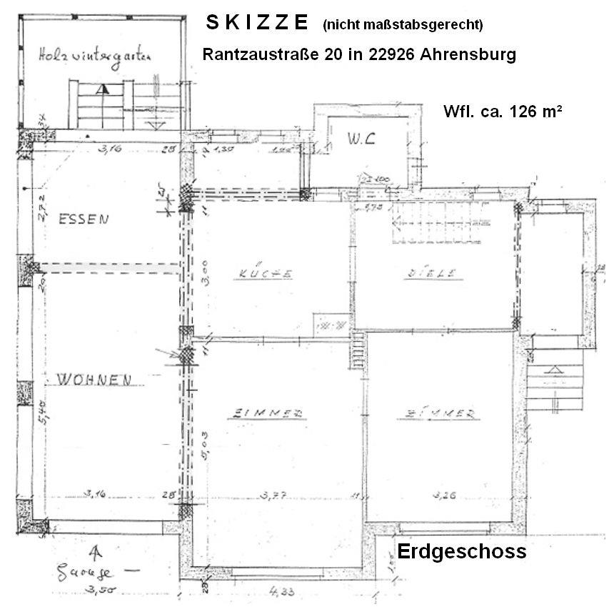 Es handelt sich hier um ein Einfamilienhaus, dass 1932 gebaut wurde. 1972 wurde das Gebäude um einen Anbau nebst Garage erweitert. Die Raumaufteilung ergibt sich aus den Grundrissen. Im Haus befinden sich seit einer grundlegenden Renovierung im Jahr 2001 hochwertige Einbaumöbel, die nicht entfernt oder verändert werden dürfen. Die Warmwasser- und Heizungsversorgung erfolgen über eine in diesem Jahr erneuerte Gaszentralheizung. Die Nebenkosten werden - bis auf wenige Positionen - direkt vom Mieter an die Versorger gezahlt. Der jährliche Heckenschnitt sowie die Dachrinnenreinigung wird von einem Gartenbaubetrieb durchgeführt, über den Umfang der weiteren Gartenarbeiten kann verhandelt werden.