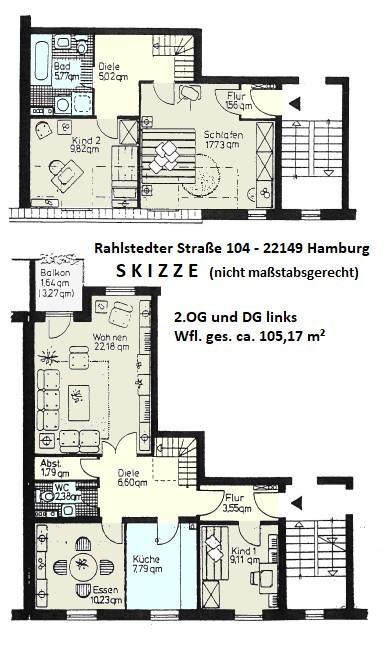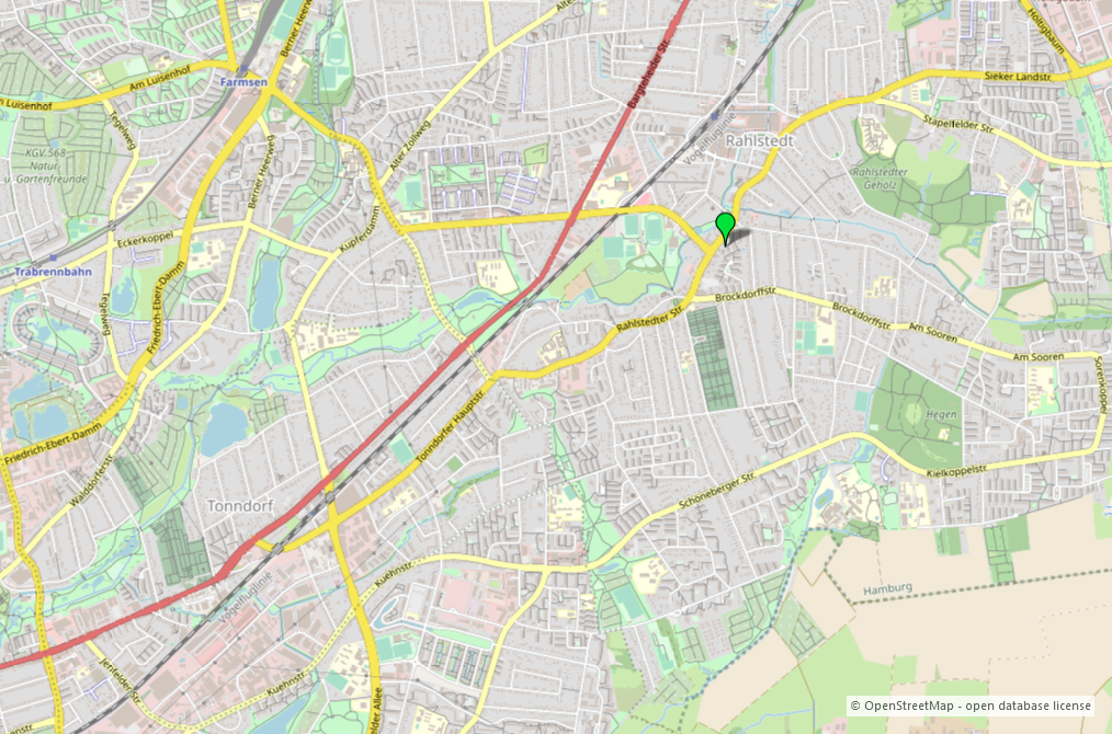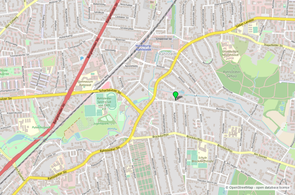 Die Maisonettewohnung befindet sich in der Rahlstedter Straße, keine zehn Minuten zu Fuß entfernt vom Rahlstedter Zentrum. Hier, in der Rahlstedter Fußgängerzone, befinden sich zahlreiche Einkaufgelegenheiten und Gastronomieeinrichtungen, außerdem findet hier mittwochs und samstags ein Wochenmarkt statt. Praktisch direkt über die Straße liegt der Liliencronpark, etwa 400 m entfernt befindet sich das Rahlstedter Familienbad. Weitere Freizeitgestaltungsmöglichkeiten sind in der näheren Umgebung in einer Vielzahl vorhanden, z. B. der Hockey- und Tennis-Club oder der Fußballplatz des Rahlstedter SC. Schulen jeder Art und Kindertagesstätten sind ebenso in großer Zahl vorhanden. Auch eine gute Anbindung an den ÖPNV ist gegeben. Bushaltestellen befinden sich weniger als 200 m entfernt. Über den Rahlstedter Bahnhof besteht Anschluss an den Regionalverkehr der Bahn und perspektivisch auch an die Hamburger S-Bahn.
