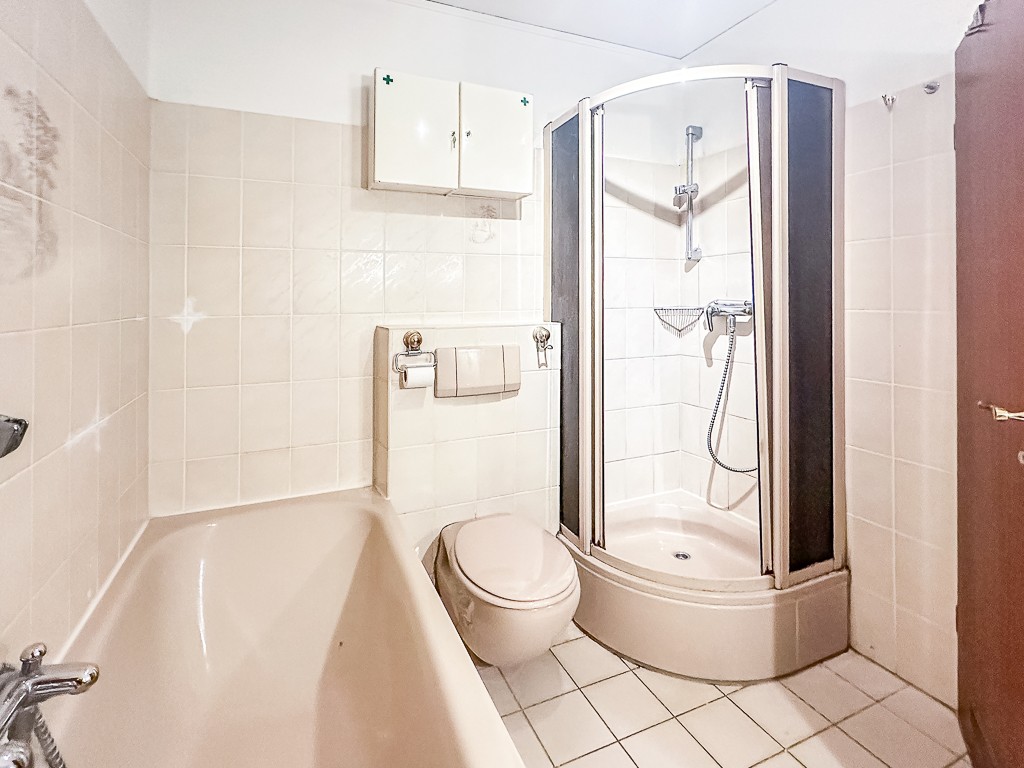 Als Maisonette bietet die Wohnung den Vorteil, dass die Bereiche für den täglichen Aufenthalt und der persönliche, nächtliche Bereich räumlich getrennt sind. Geradezu optimal geeignet ist die Wohnung für eine Familie mit einem Kind, in dem Fall steht ein weiteres Zimmer als Gäste- bzw. Arbeitszimmer zur Verfügung. Die Ausstattung ist nicht mehr neu, aber gepflegt und technisch einwandfrei. Das Badezimmer im Dachgeschoss bietet wahlweise eine Duschkabine und eine Badewanne, das WC auf der "Wohnebene" beschränkt sich auf das Wesentliche. Die hübsche Küche ist sicherlich noch weitere Jahre nutzbar. Die Räumlichkeiten selbst sind ansonsten weitgehend neutral gehalten und mit weißen Wänden und Laminatböden ausgestattet. Zur Wohnung gehört ein Sondernutzungsrecht über eine Abstellfläche im Spitzboden. Außerdem wird mit der Wohnung ein Stellplatz in der Tiefgarage verkauft, der als Teileigentumseinheit über 6/10.000 Miteigentumsanteile verfügt. Für Maßnahmen, die ausschließlich die Garage betreffen, wird eine gesonderte Rücklage angespart.