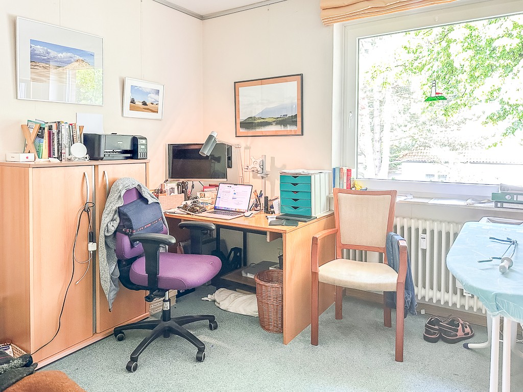 Die Wohnung liegt im 1. Obergeschoss der kleinen Wohnanlage. Über den großzügigen Dielenbereich sind linker Hand die geräumige Küche und gegenüber das einladende Wohnzimmer zugänglich. Geradezu gelangt man in das Badezimmer und das Gäste-WC, rechts befindet sich das Schlafzimmer, links befinden sich die beiden kleineren Räume, die vielseitig nutzbar sind: als Kinderzimmer, Arbeitszimmer, Gästezimmer oder einfach als Esszimmer. Eine praktische Abstellkammer ist ebenfalls vorhanden. Die Räume sind entweder mit Teppichboden oder Parkett ausgestattet. Neben einem Tiefgaragenstellplatz gehört zu jeder Wohnung auch ein Kellerabstellraum. Durch die Größe und Raumaufteilung, insbesondere aber durch die ruhige Lage ist diese Wohnung für Familien und Paare gleichermaßen gut geeignet.