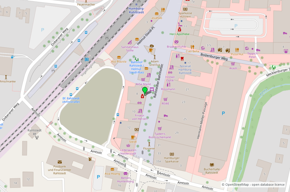 Die Rahlstedter Bahnhofstraße ist Teil der Fußgängerzone, hier befinden sich neben dem EKZ "RahlstedtCenter" ein Bahnhof, eine Postfiliale und etliche weitere Einkaufsmöglichkeiten. In der Fußgängerzone findet der Wochenmarkt (mittwochs und samstags) statt, zudem regelmäßig ein Bio-Markt. Auch hierdurch hat die Fußgängerzone eine recht große Anziehungskraft auch auf die benachbarten Stadtteile.