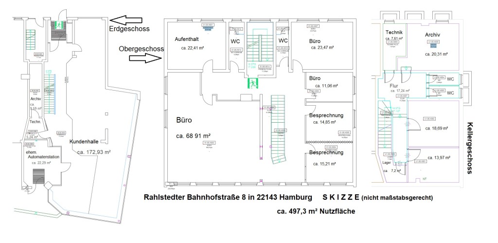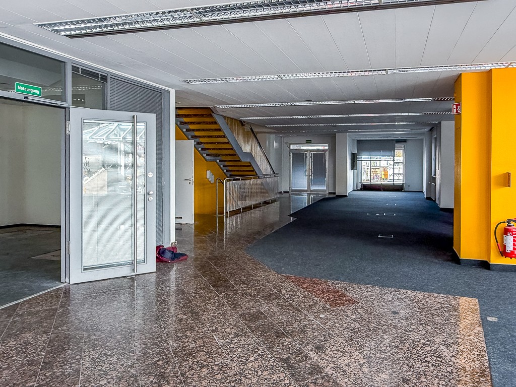 Das Gewerbe befindet sich im Erdgeschoss eines 1962 erbauten und 1975 im vorderen Bereich um einen Anbau erweiterten Gebäudes. Die großzügige Fläche setzt sich zusammen aus den im Erdgeschoss zugänglichen Geschäftsräumen und zusätzlichen Büros im Obergeschoss. Außerdem stehen umfangreiche Kellerflächen zur Verfügung. Der letzte Mieter war eine Bankfiliale. Die Schaufensterfront bietet optimale Werbemöglichkeiten, da die Rahlstedter Fußgängerzone gut frequentiert ist. Die Fensterfront erstreckt sich auf ganzer Länge des Gebäudes auch entlang der Seitenstraße, die zum Rahlstedter Bahnhof führt. Hierdurch steht auch ein zweiter Ein- bzw. Ausgang auf der Gebäuderückseite mit direktem Zugang zum Busbahnhof zur Verfügung. Bei Bedarf können die Flächen im Obergeschoss relativ unkompliziert abgeteilt werden, es können problemlos separate Eingänge hergestellt werden. Sprechen Sie uns gerne darauf an. Ggf. kann auch die Treppe zwischen Erd- und Obergeschoss verschlossen werden. Kaution: 3 x NKM = 23.220,00 EUR; Vermittlungsprovision: 27.631,80 EUR einschl. MwSt.