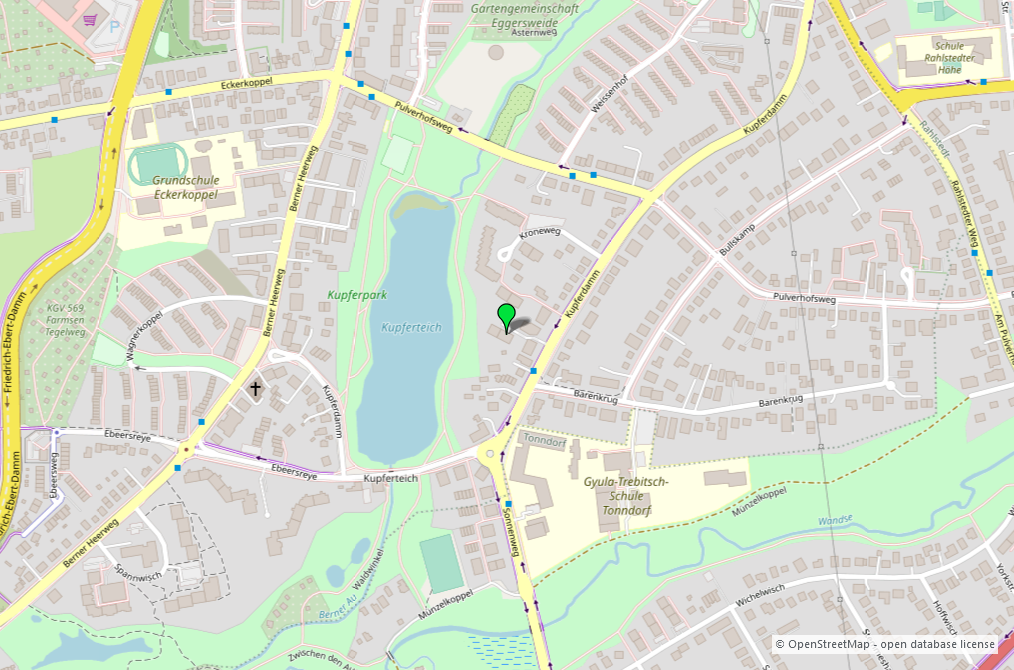 Die Wohnung liegt in einem Gebäude auf dem hinteren Grundstücksteil im Kupferdamm. Dieser liegt zentral zwischen Tonndorf, Rahlstedt und Farmsen. Praktisch direkt angrenzend befindet sich die Berner Au mit dem Kupferteich, einem Nebengewässer der Wandse, für Naherholung ist also gesorgt. Die umliegenden Stadtteile sind leicht per Auto oder ÖPNV erreichbar. So sind Einkaufsmöglichkeiten aller Art gut erreichbar. In der näheren Umgebung sind entsprechende Angebote auch zu Fuß zugänglich.