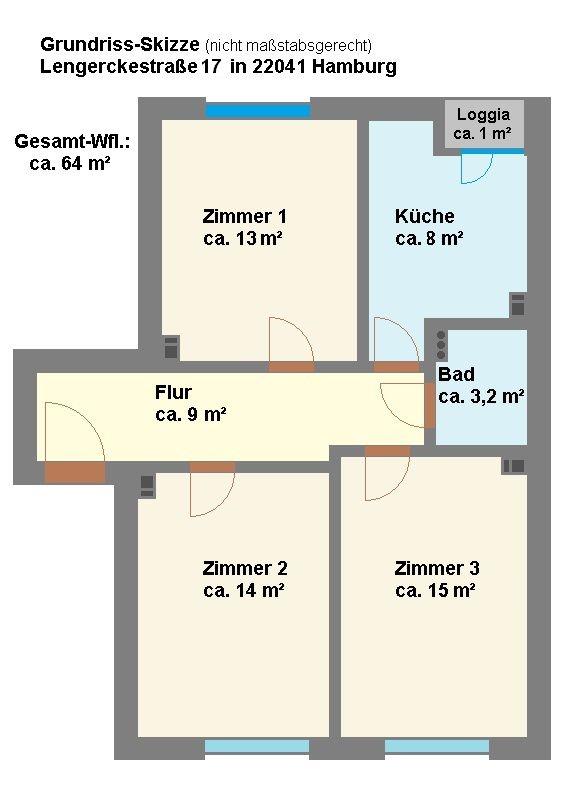 Die Wohnung ist ca. 64 m² groß und bietet drei Zimmer, eine Küche mit Sitzgelegenheit und einer kleinen Loggia sowie ein Vollbad. Im Rahmen von Modernisierungsmaßnahmen wurde hier bereits eine Gasetagenheizung installiert. Die günstige und zentrale Lage in der Nähe des Wandsbeker Quarrees sorgen dafür, dass die Wohnungen in dieser Anlage ausgesprochen gut vermietbar sind und solide Mieteinnahmen versprechen. Durch die recht ähnlichen Größen der Räume wäre diese Wohnung auch für eine Wohngemeinschaft gut geeignet. Die Wohnung wird frei geliefert und eignet sich damit auch zum direkten Bezug durch neue Eigentümer. Insgesamt befindet sich die Wohnung in einem guten Zustand, der auch eine schnelle Neuvermietung ? falls erwünscht ? möglich macht. Die zuletzt erzielte Miete lag bei EUR 10 EUR/m².